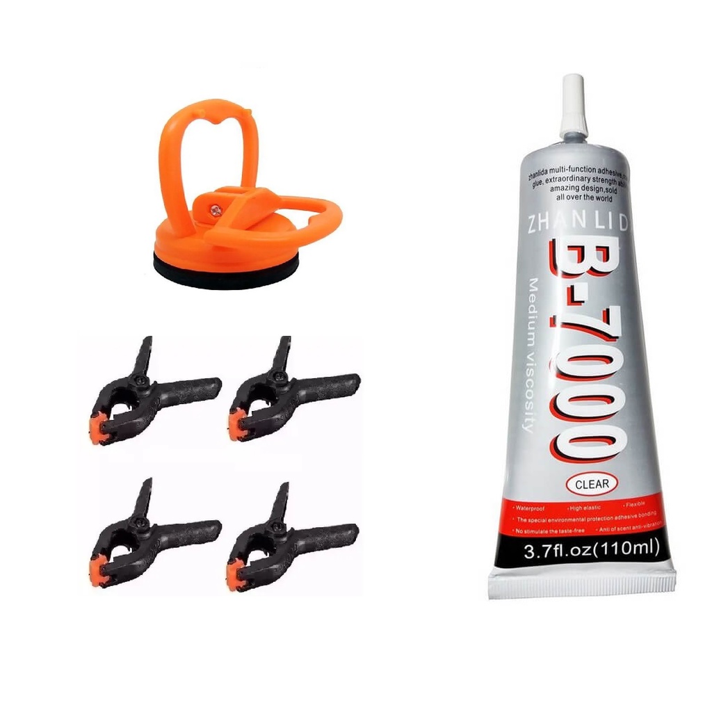 Kit Cola Transparente B7000 110ml + 4 Grampo Fixação + Ventosa de Sucção ideal para reparos em celulares e tablets em geral
