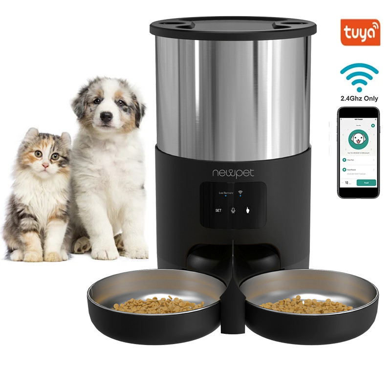 Newpet 5L Gatos e Cães Alimentador Pet Automático Inteligente Double Bowls WIFI APP Controle Remoto Para O Cão Gato Comida Dispenser Timing Gravação De Voz Tigela De Aço Inoxidável Duty Free - Em estoque