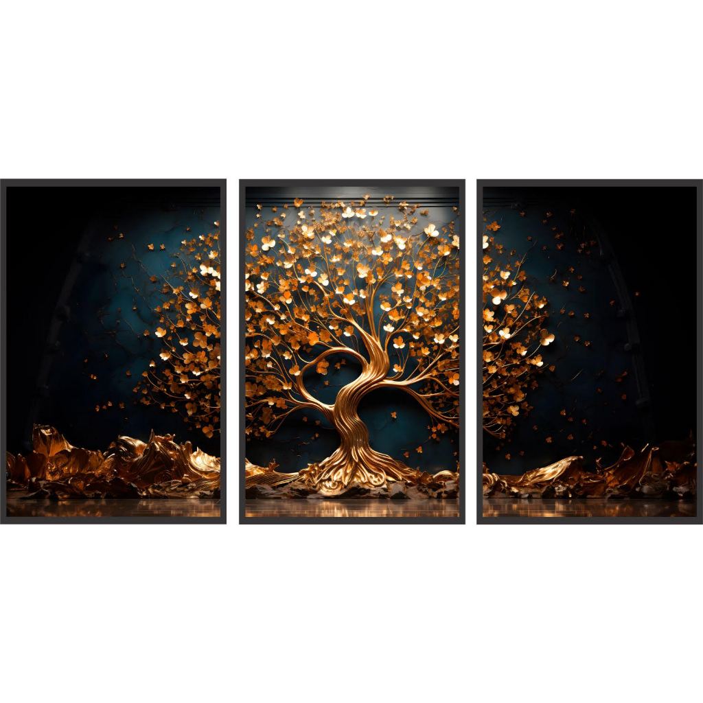 Quadro decorativo para quartos e sala árvore da vida dourada 3 peças n021