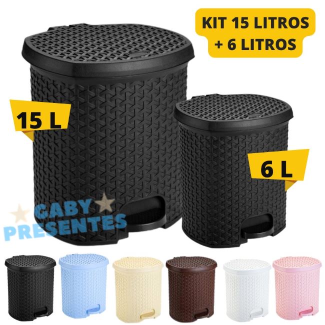 KIT Lixeiras Plásticas 15 L + 6 L Com Pedal Rattan Coloridas p/ Cozinha/Banheiro/Escritório/Quarto Bebê