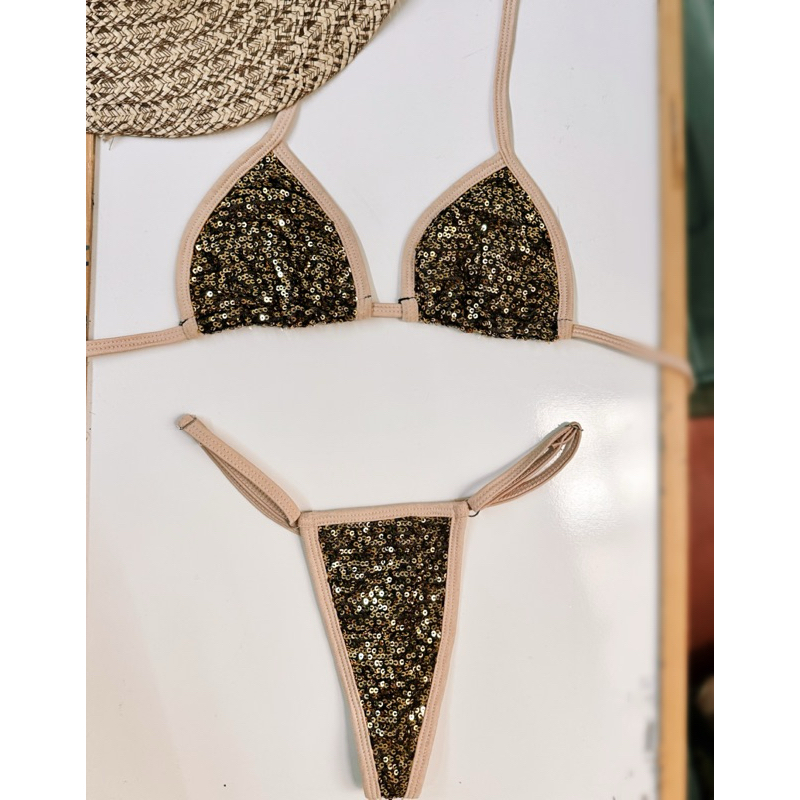 Biquíni Fita Fio Dental Virgínia Paetê Cortininha Marquinha de Bronze