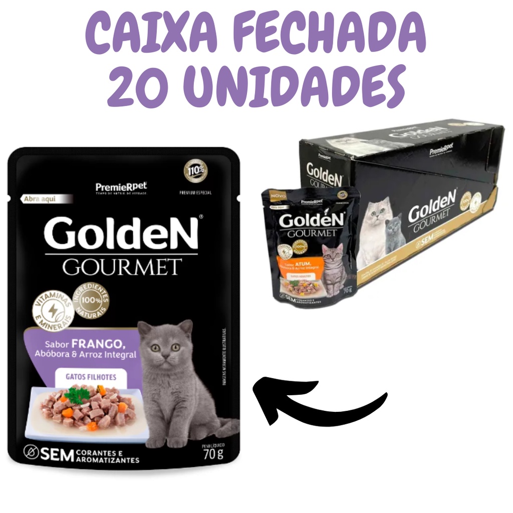 Ração Úmida Golden Gourmet para Gatos Filhotes Sabor Frango 70g caixa fechada 20 unidades
