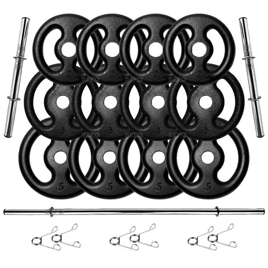 Kit com 50 Kg de Anilhas Ferro Fundido + Barras com Presilhas