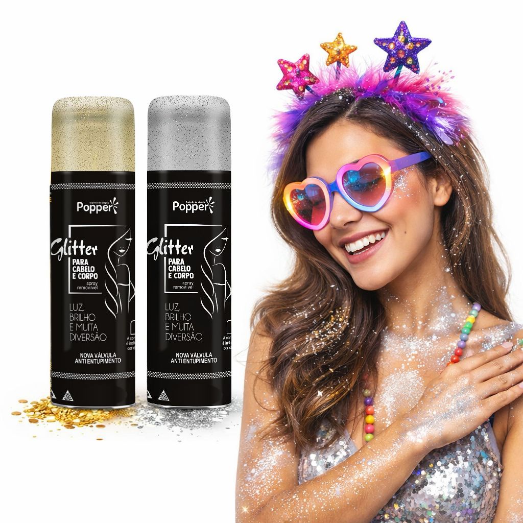 Spray Glitter Popper para Cabelo Corpo Removível Prata Dourado Festa Carnaval 135ml/85g