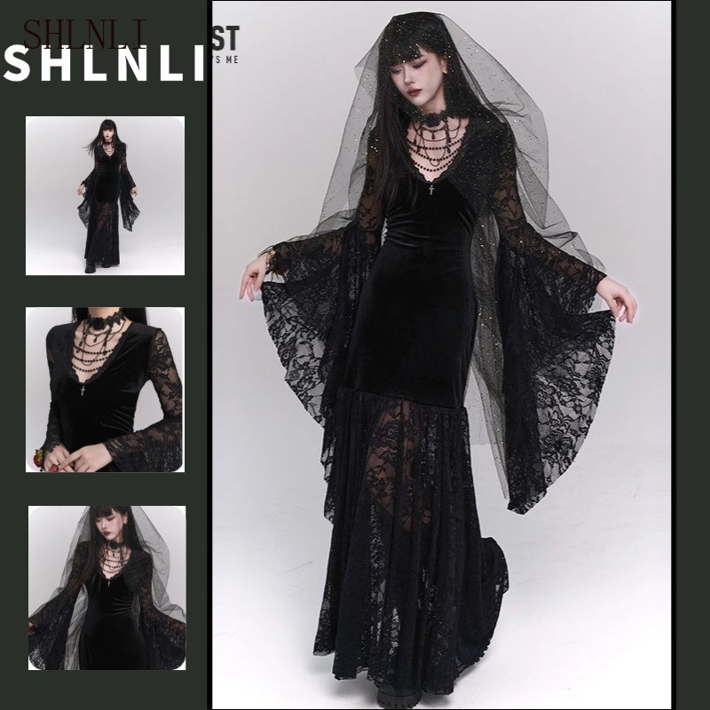 Feminino Estilo Gótico Francês Retro Vestido Halloween Com Decote Em V Rendas Trajes De Manga Comprida Saia