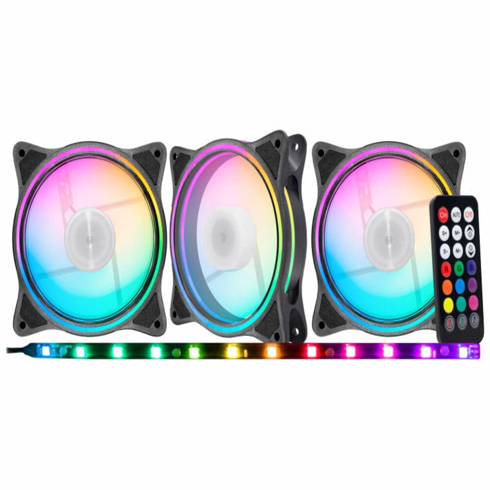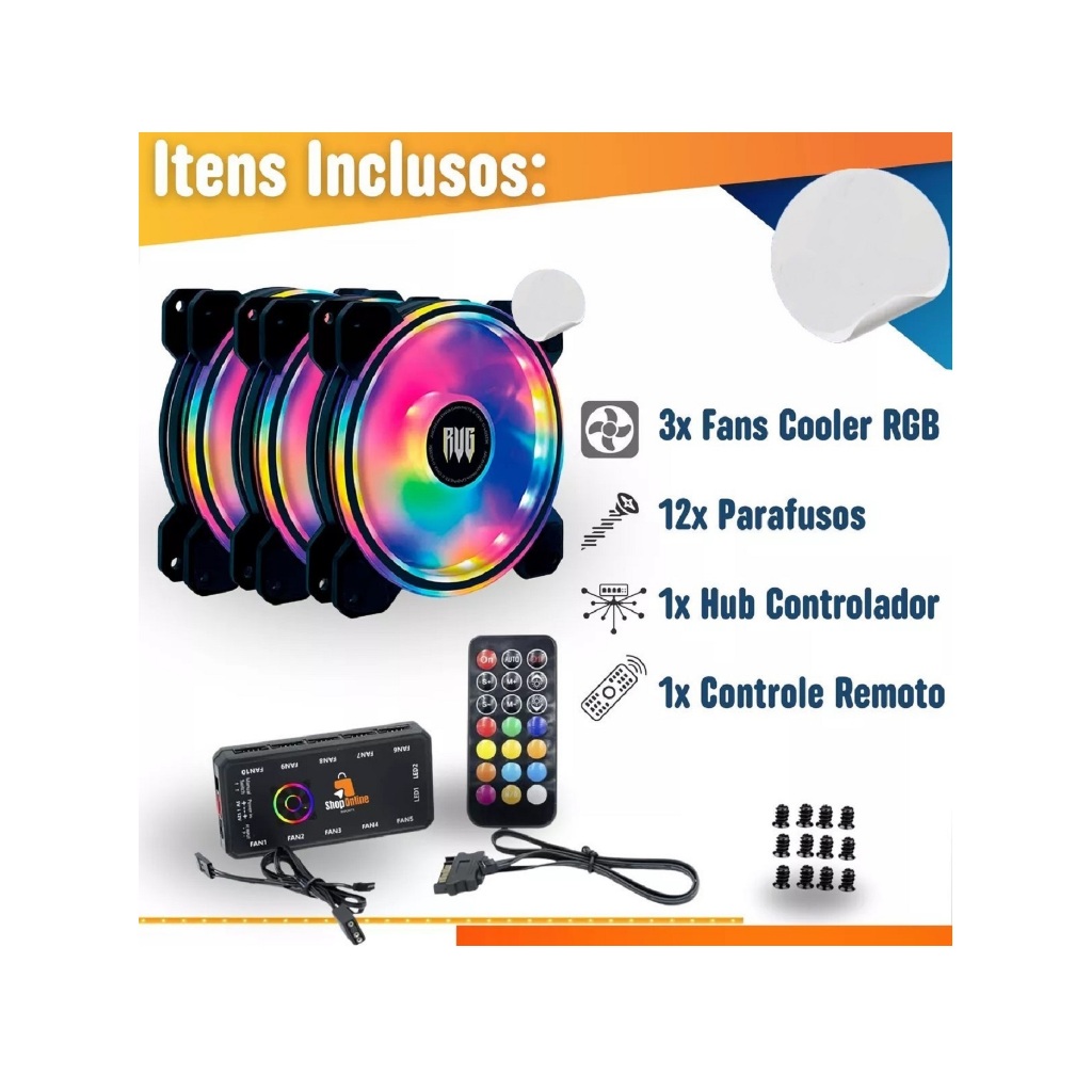 Kit Fan Com 3 Coolers Argb Ritmico Aaja K-mex Rainbow Com Fita Controle e Controladora