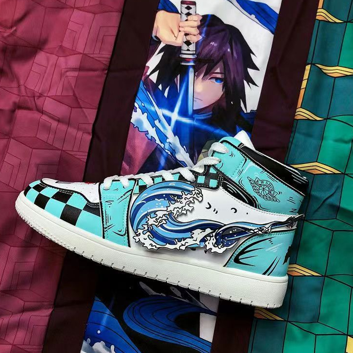 Men's shoes, fashionable anime, Japanese ghost blade integrated comfortable blue water flow sports shoes, high top sports shoes