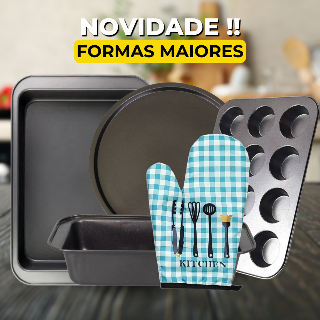 Forma KIT COM 4 Forma Assadeira Retangular Pizza Pão Cupcake 6 Furos e Luva de Cozinha