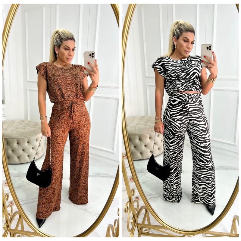 Conjunto de calça Pantalona Feminino Cropped Blusinha Zebra/Onça e Liso Moda Blogueira