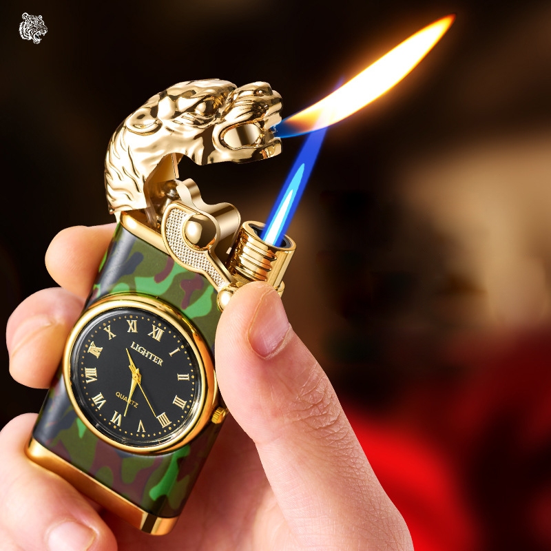 Isqueiro Maçarico Recarregável Gás Cabeça de dragão de metal Com Relógio