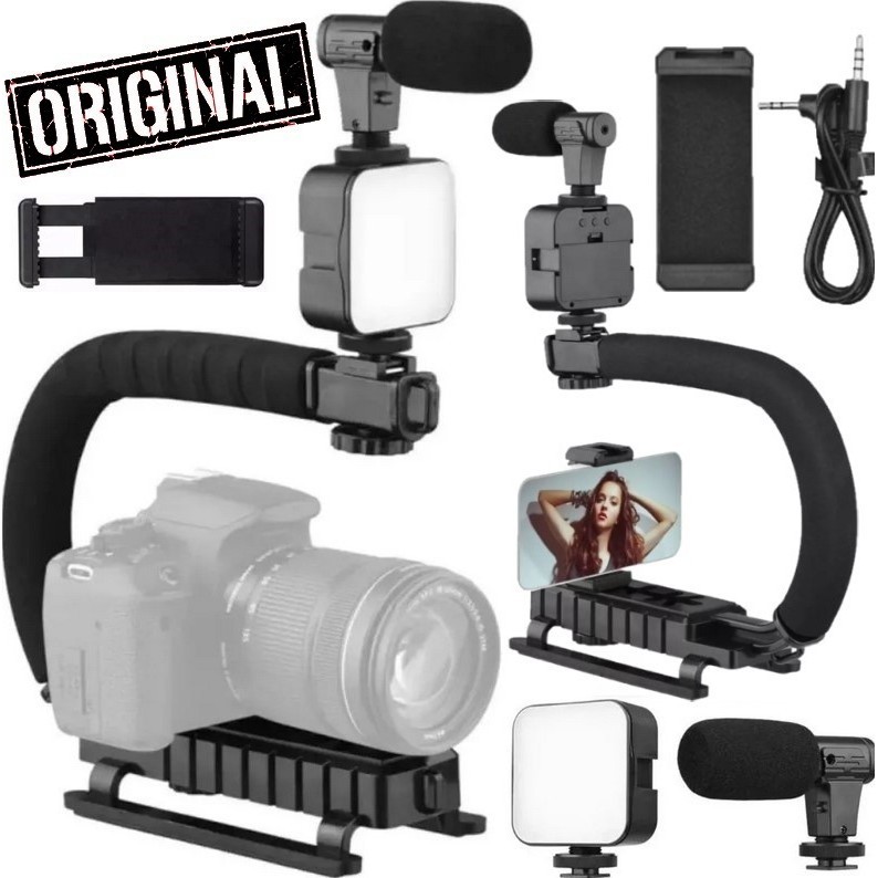 Estabilizador De Câmera Pro e Com Microfone Portátil Para Filmadora + Suporte Celular e Iluminação DSLR