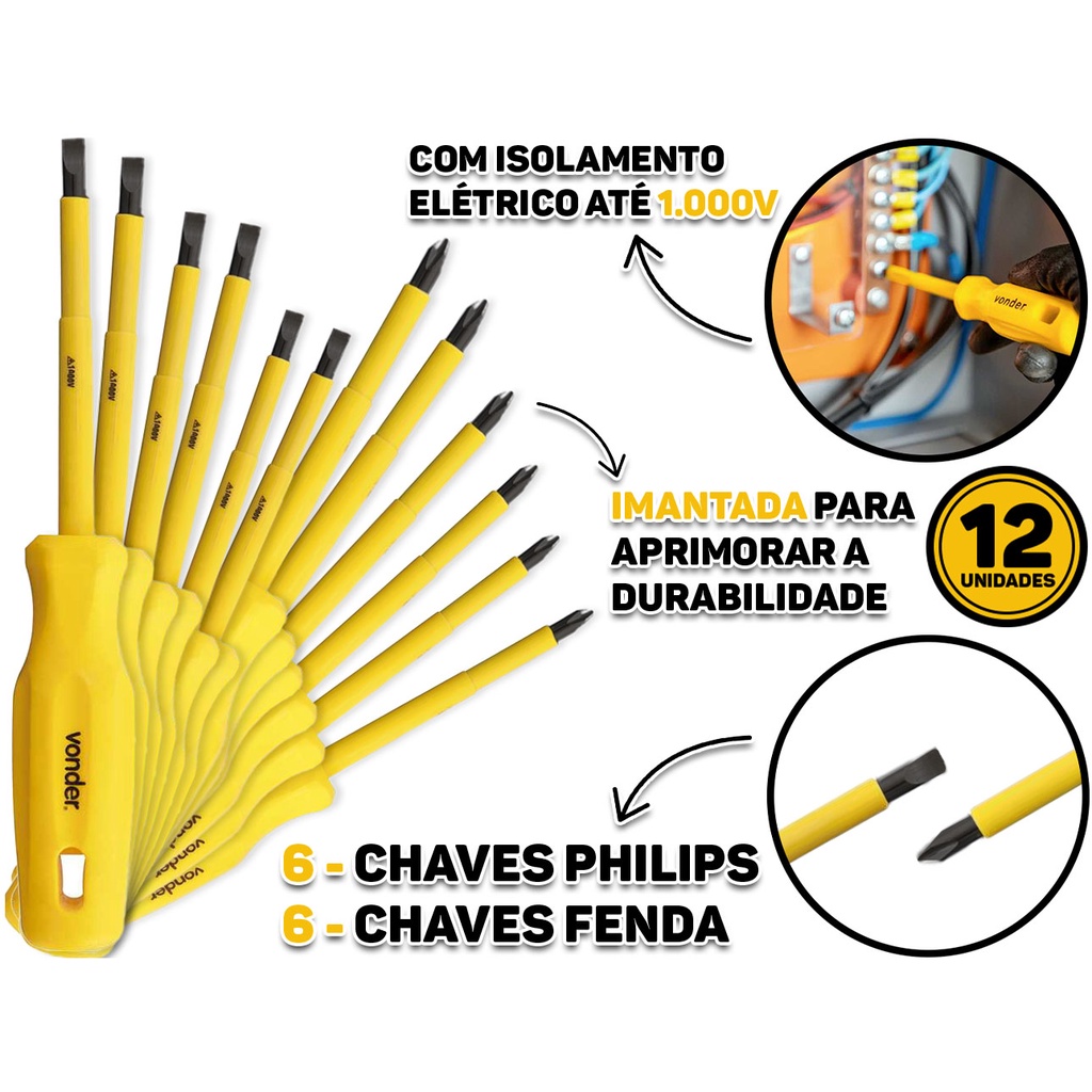 Conjunto Kit 12 Chaves De Fenda E Phillips Haste Isolada Ponta Magnetizada Imantada Cabo Anatômico Jogo Vonder