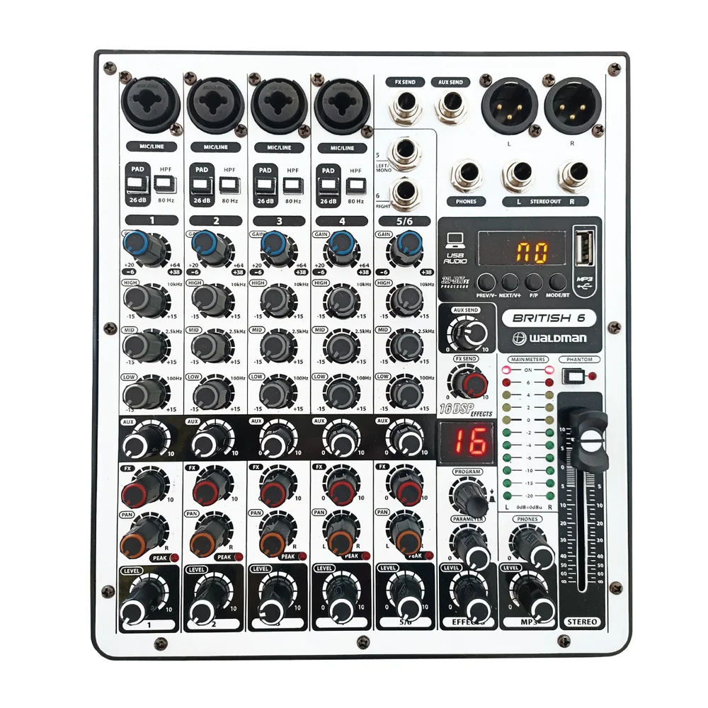 Mesa De Som 6 Canais British-6 Waldman Bivolt Com Efeitos, Bluetooth, USB, Display, MP3, Phantom Power, Equalização E Ajustes