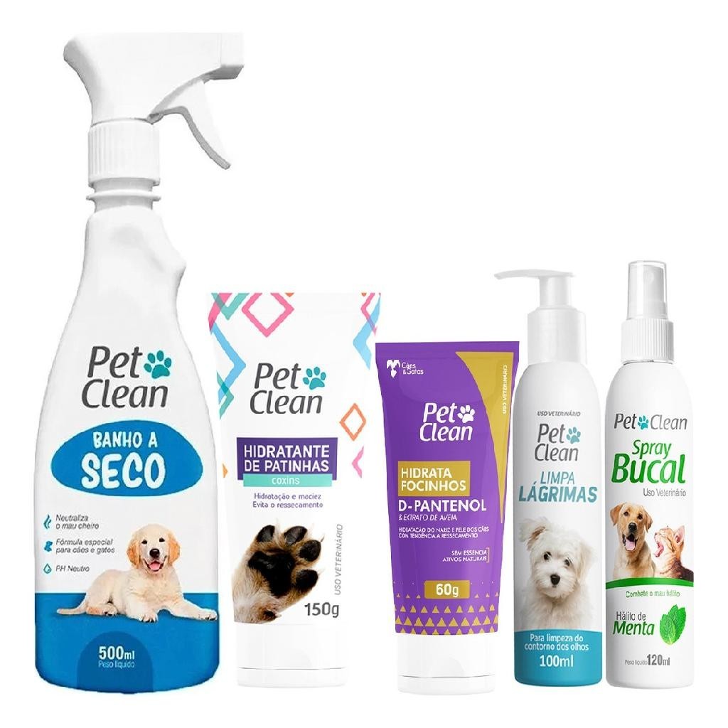 Kit Banho A Seco + Hidratante de Patinhas + Hidrata Focinho + Limpa Lágrimas e Spray Bucal Pet Clean