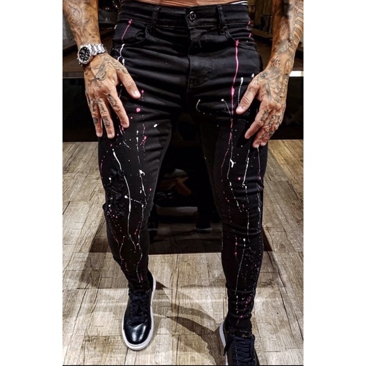 Calça Jeans Masculina Preta Lycra Skinny Elastano Destroyed Tinta Splash