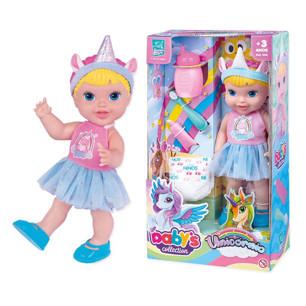 Boneca Baby Collection Unicórnio Faz Xixi com dentinho e escova e mamadeira