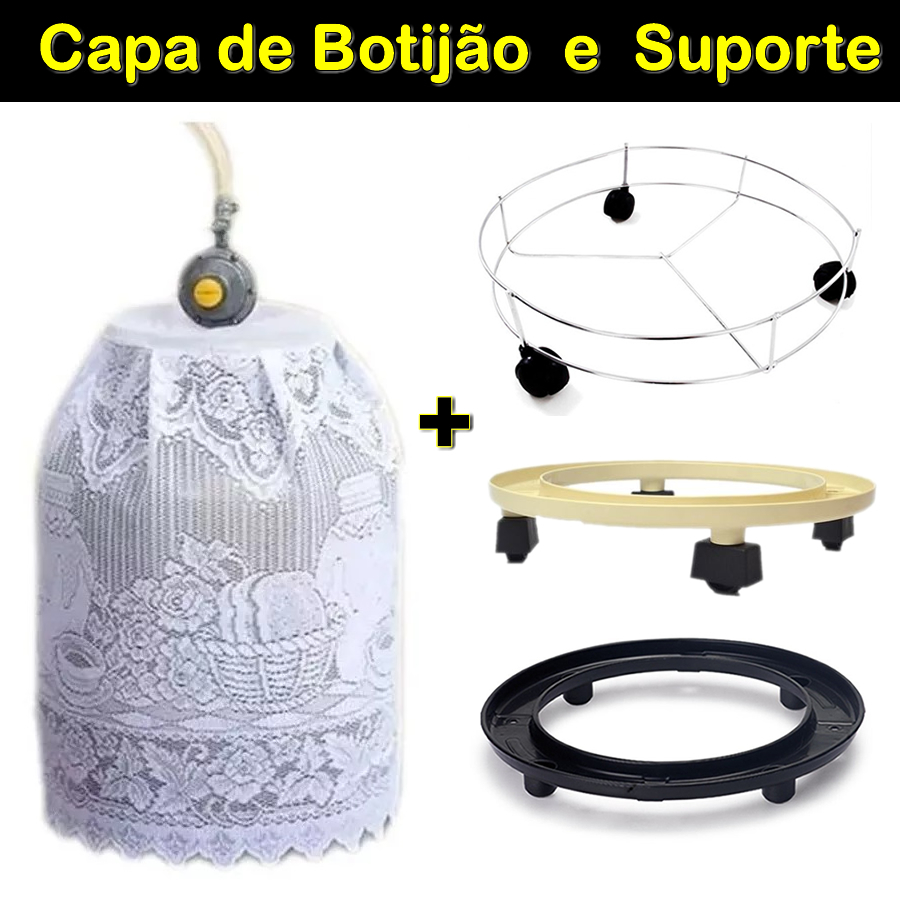 Capa de Botijão de Gás de 13 Kg - Renda Branca e Suporte de Botijão de Gás 13kg - com rodinhas ou sem - metal ou plástico - PANAMI