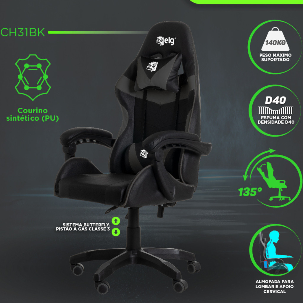 Cadeira Gamer Ergonômica DRAKON ELG, CH31BK, Inclinação até 135º e 140kg, Espuma D40,