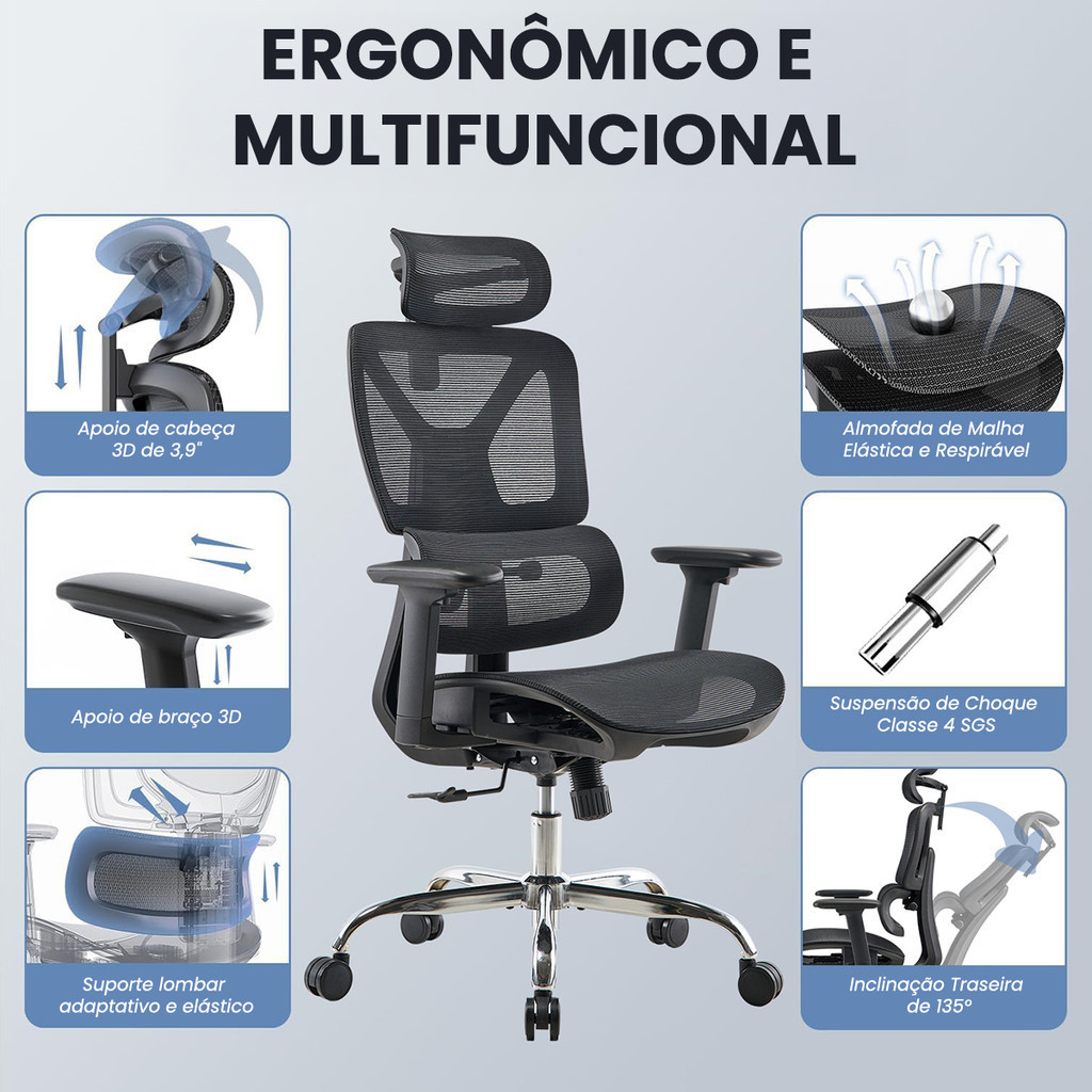 Cadeira Ergonômica Escritório Gamer Estudo Ajustável Apoio Lombar Confortável Tecido Respirável 150kg