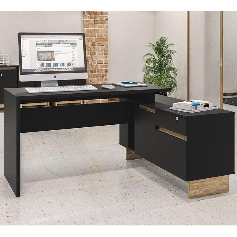 Mesa de Canto para Escritório Politorno Los Angeles com 1 Porta e 2 Gavetas - Preto/ Carvalho Claro