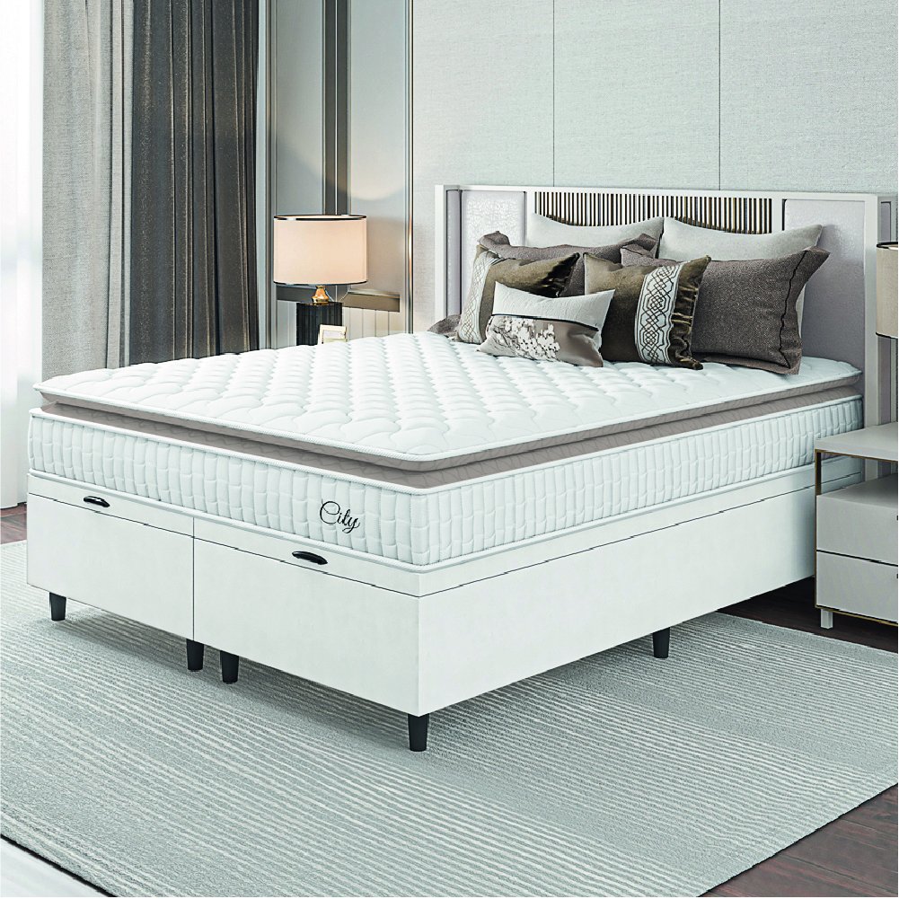 Cama Box Colchão Baú Casal King Molas Ensacadas City Pillow Top 193x203x64cm Bege Branco