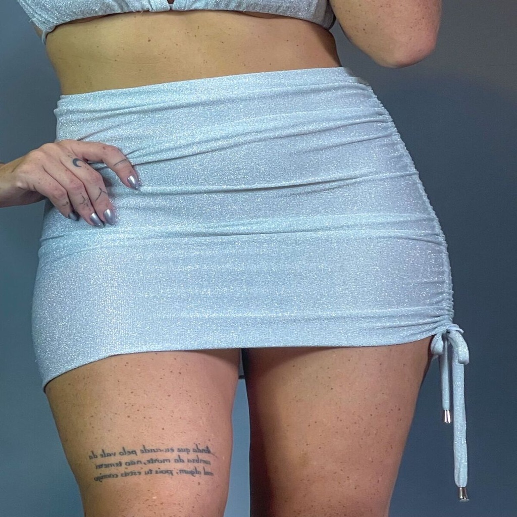 Saia curta de brilho prata drapeada franzida de puxar
