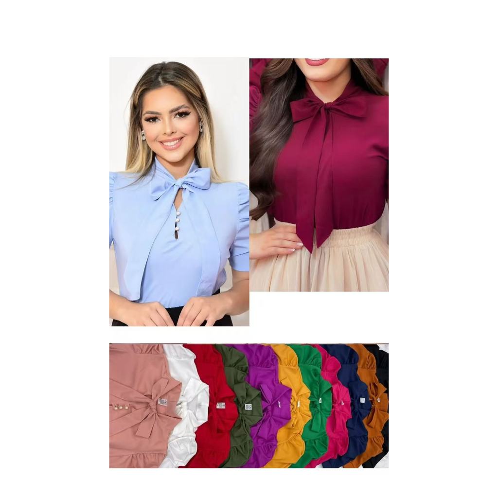 Blusa Plus Size G1 G2 G3 Feminina Social Manga Curta Bufante com laçinho Moda evangélica -0260