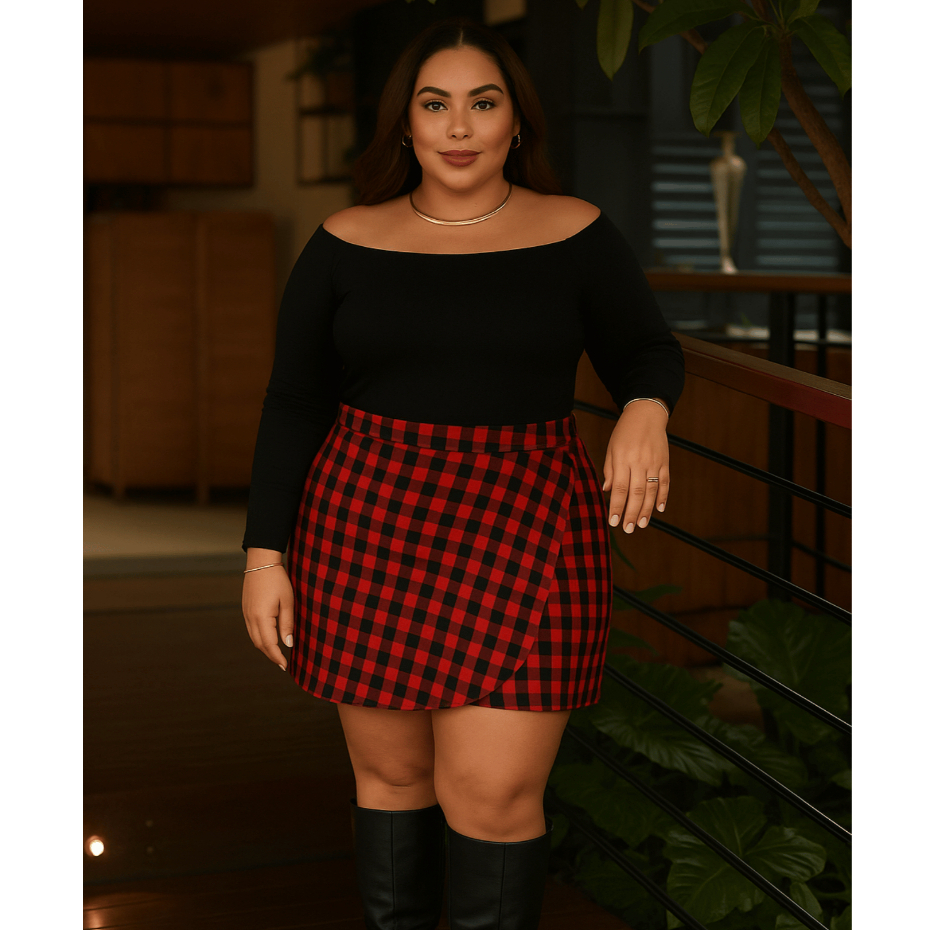 Marguerite - Short-Saia Xadrez com Sobreposição Plus Size