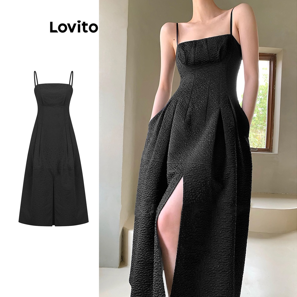 Lovito Elegante Vestido Feminino Floral Alinhado de Jacquard com Fenda Frontal L71ED172 (Preto)