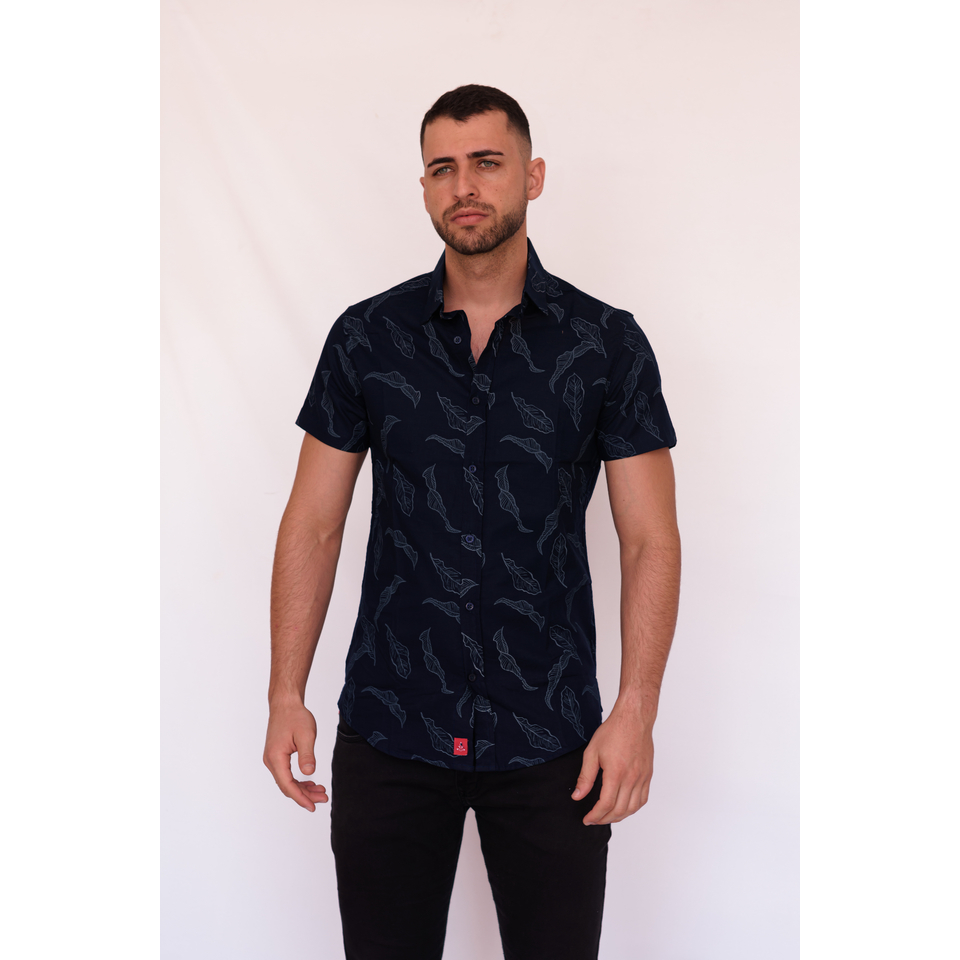 CAMISA SOCIAL COM BOTÕES MASCULINA MANGA CURTA FLORAL EM LINHO AZUL