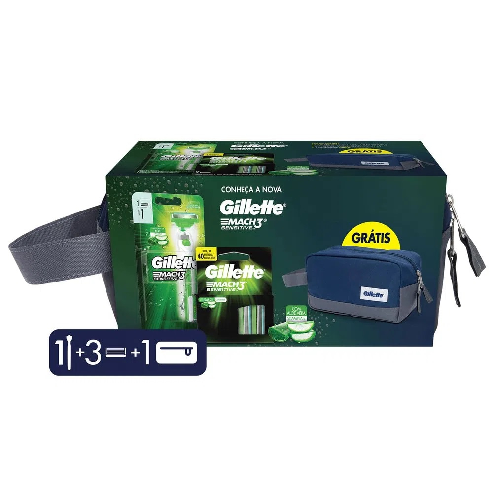 Kit Aparelho de Barbear Gillette Mach3 Sensitive AquaGrip 1 Unidade + 3 Refis + 1 Necessaire