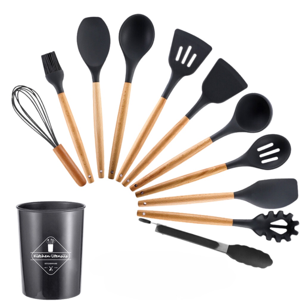 Jogo de Cozinha Preto Kit C/12 Peças de Silicone, Utensílios e Copo Suporte para Cozinha Cabo de Madeira
