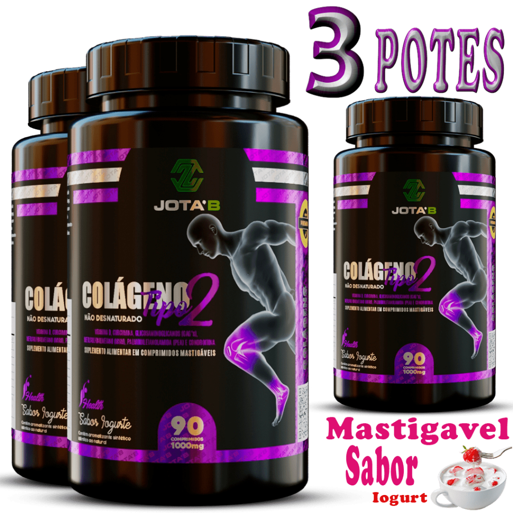 Kit Colágeno Tipo 2 Não desnaturado 90 cápsulas 1000mg Sabor Iogurte -JOTA´B - Puro / Rejuvenescimento / Antirrugas / Articulações - 3 unidades