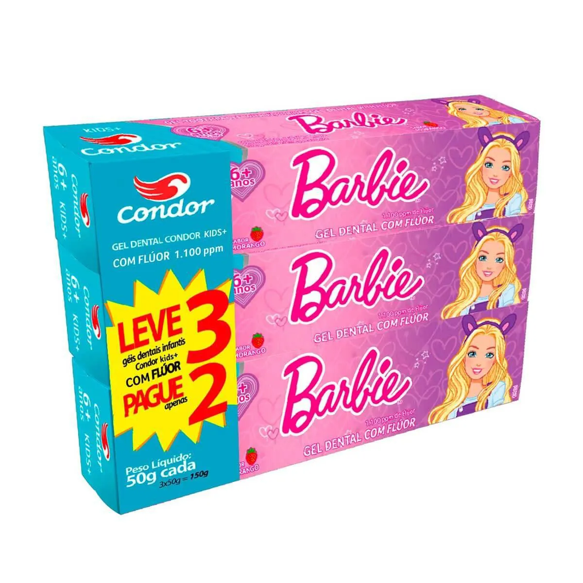 Kit Gel Dental Infantil Condor Kids Barbie com 3 unidades de 50g cada