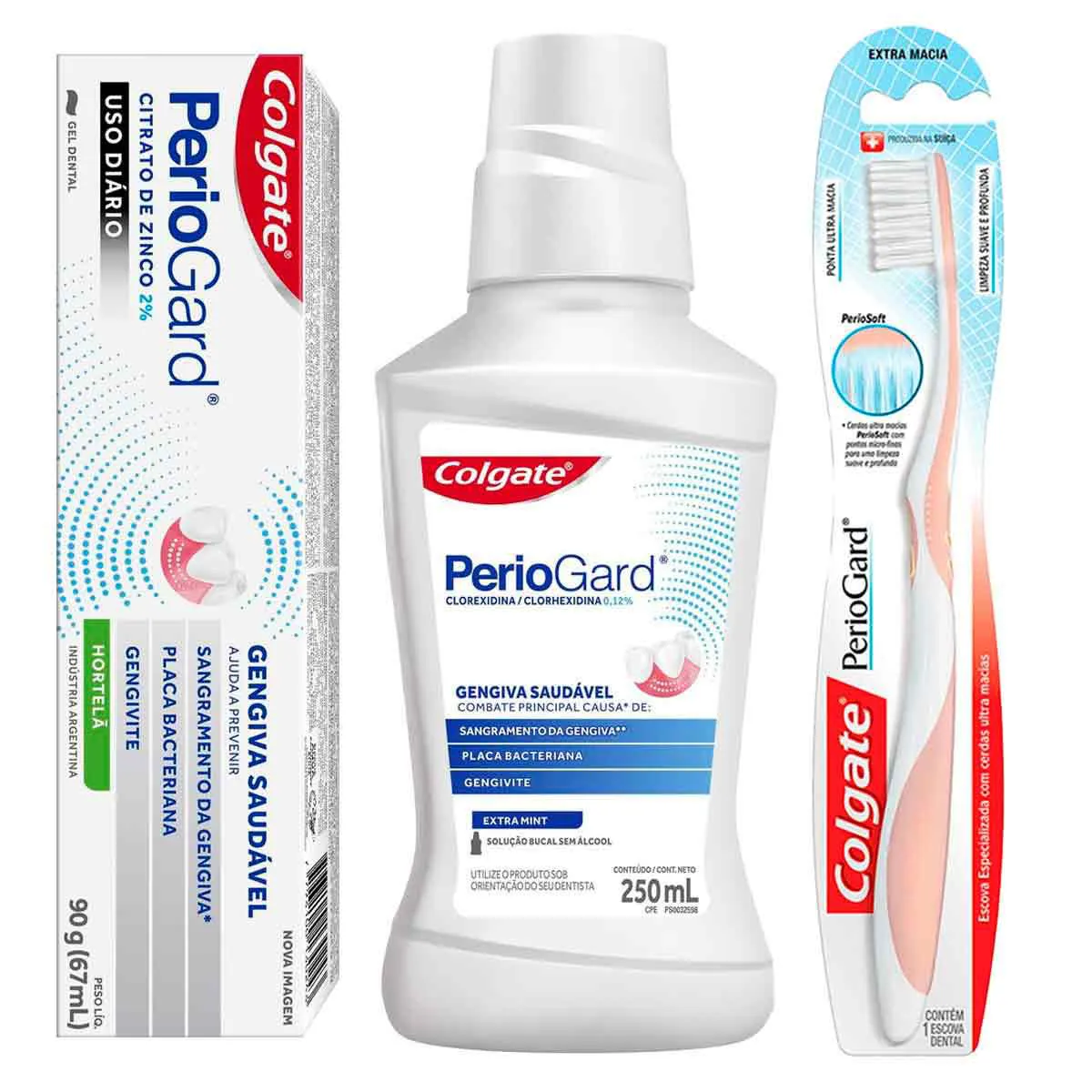 Kit Cuidado com a Gengiva Periogard Pasta de Dente em Gel Sabor Hortelã + Escova de Dente Extra Macia + Enxaguante Bucal Sem Álcool Extra Mint