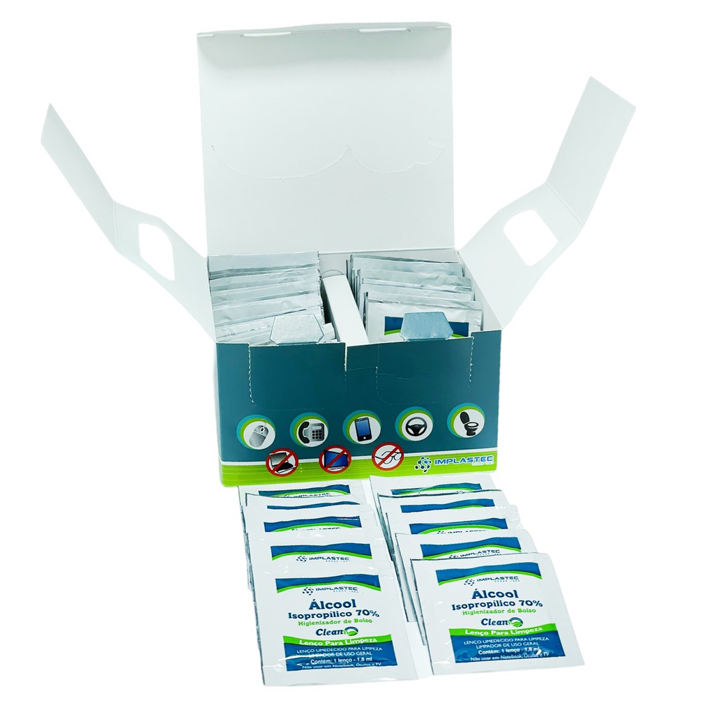 Lenço Umedecido Álcool Isopropílico 70% Higienizador Antigerme para Superfície Mãos Telas Caixa com 50 Sachês