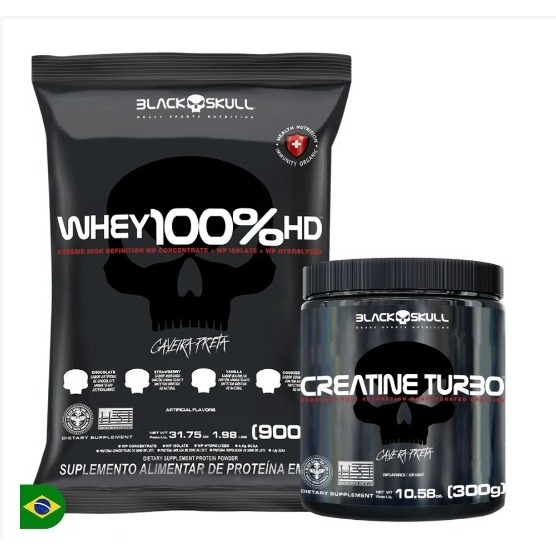 Kit Whey 100% HD Whey Protein 900g + Creatina Turbo Monohidratada 300g - Black Skull Caveira Preta
