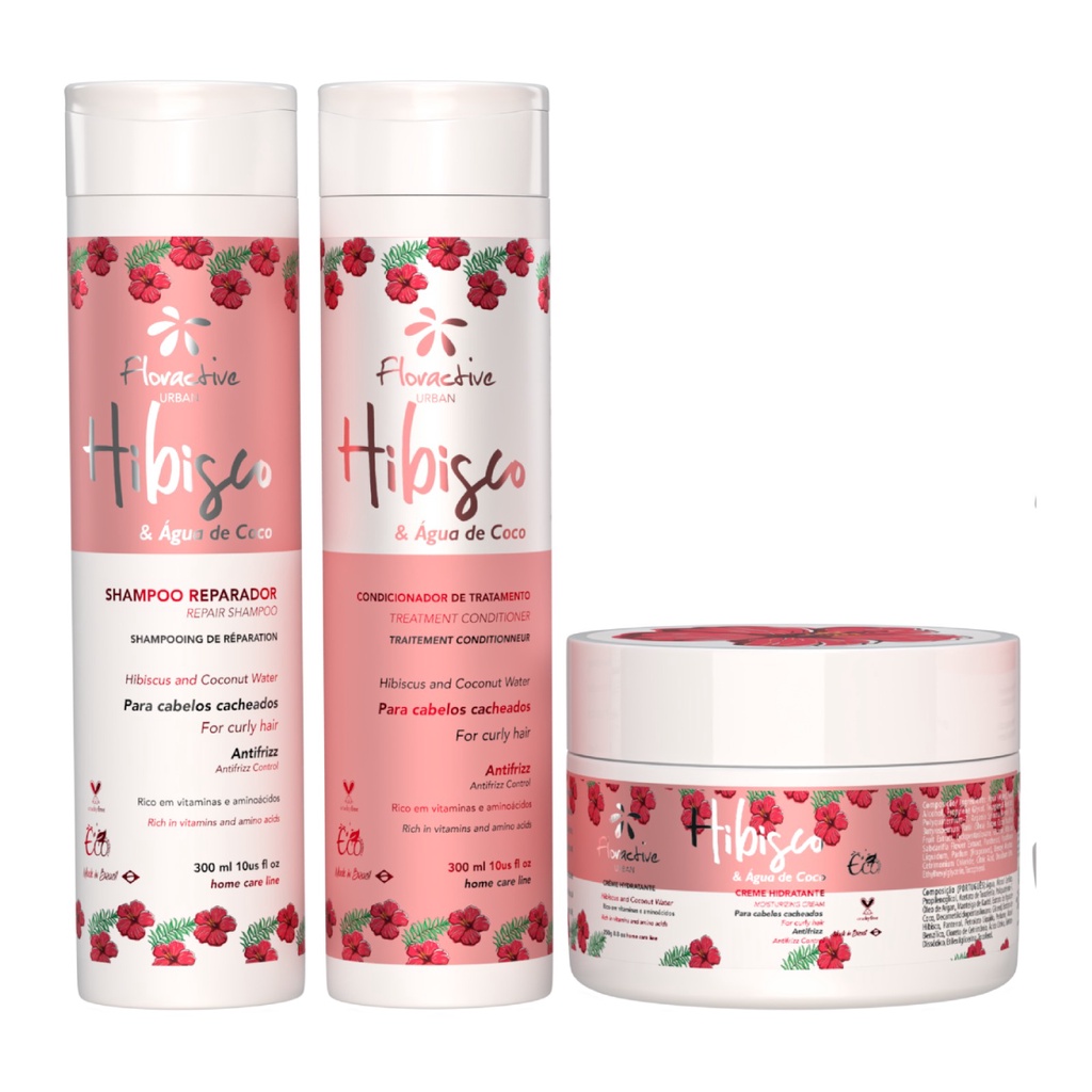 KIT SHAMPOO CONDICIONADOR E MASCARA HIBISCO E AGUA DE COCO PARA CABELOS CACHEADOS
