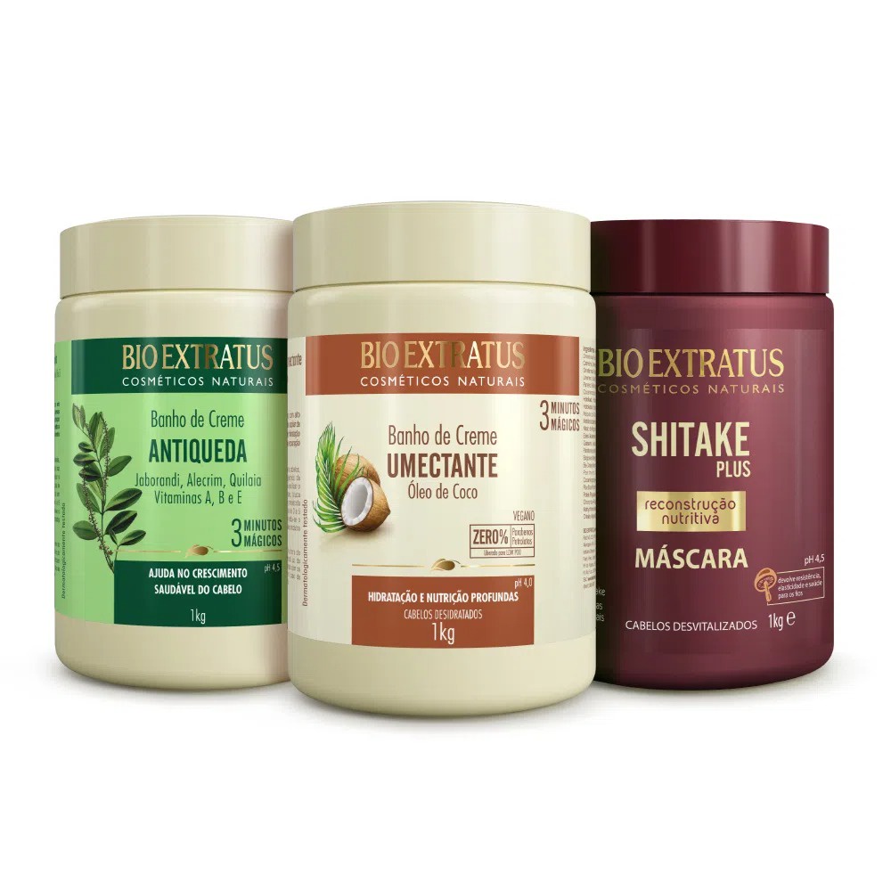 Kit Cronograma Capilar 3 Máscaras 1kg- Umectante - Jaborandi -Shitake - Banho de Creme Bio Extratus