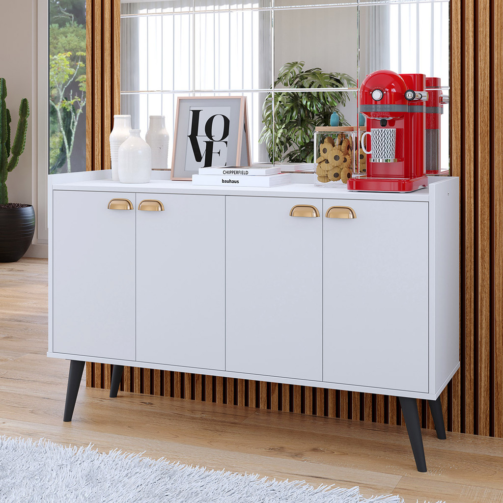 Aparador Buffet Café Bar 4 Portas Balcão Luxo Pés Palito Retrô Puxador Concha Decoração Sala de Jantar com Prateleira