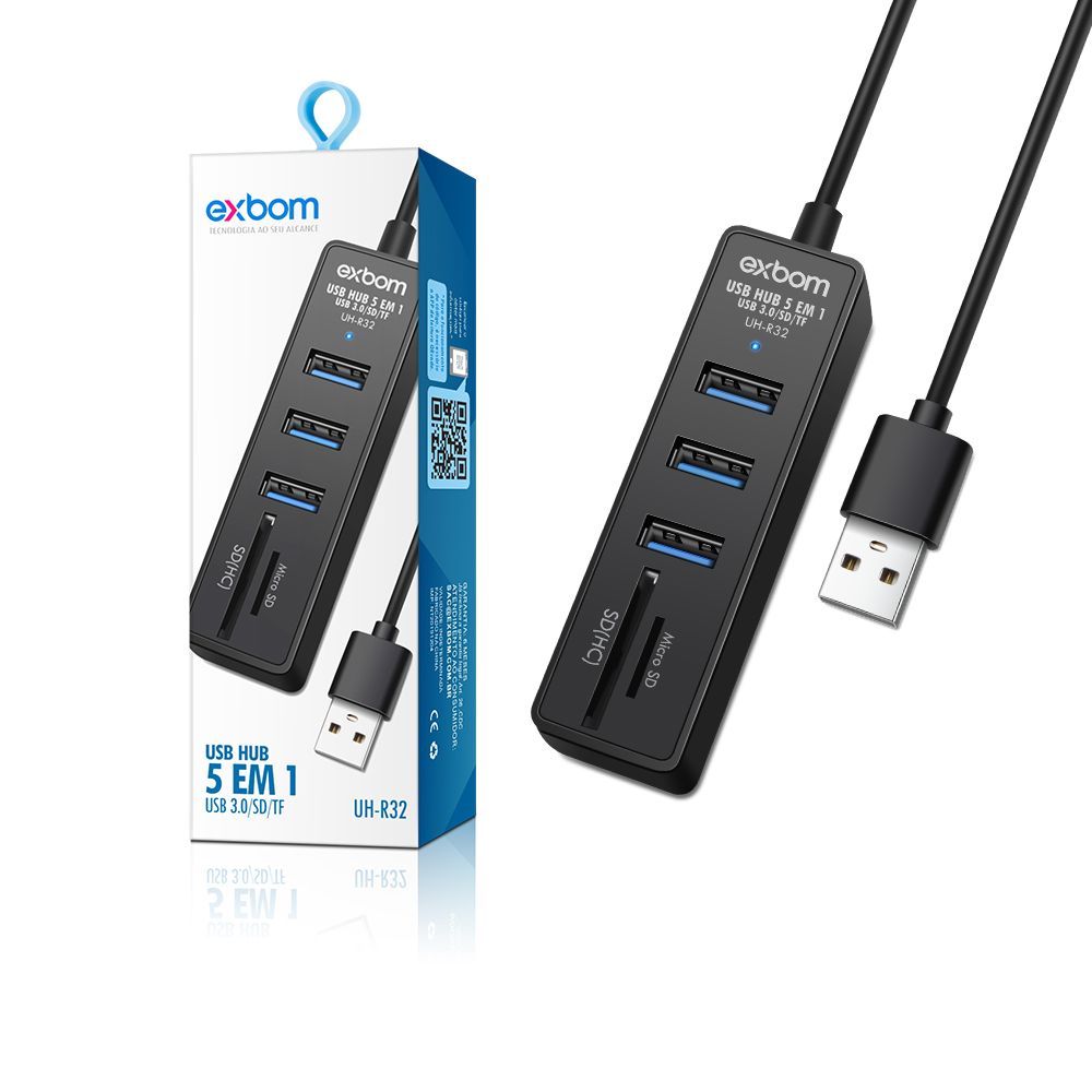 Hub USB 3.0 5Gbps Combo 5 em 1 UH-R32 com 3 portas USB e 2 Leitor de Cartão SD/MicroSD carregamento smart inteligência