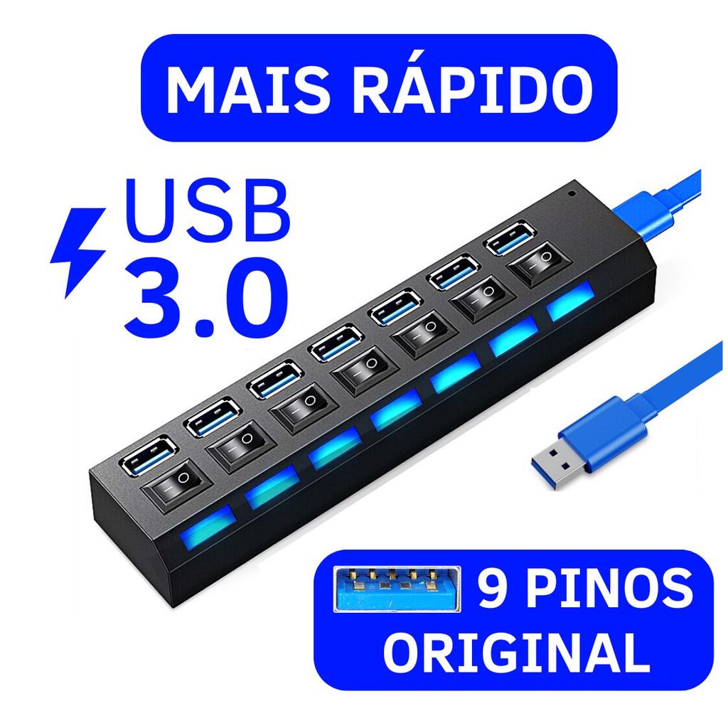 Régua Hub Usb 3.0 7 Portas Extensão Rápida Hub Usb 7 portas 3 0 Pendrive Not HD Mouse Impressora Carregamento e Transferência Extensão Usb
