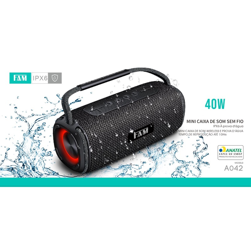 Caixa De Som 40W RGB a água IPX6 Bateria 10 Horas FAM A042 conexão Bluetooth, possui entrada para Cartão Micro SD, USB (Pen Drive) e auxiliar P2, fornecendo flexibilidade de uso para qualquer tipo de dispositivo.