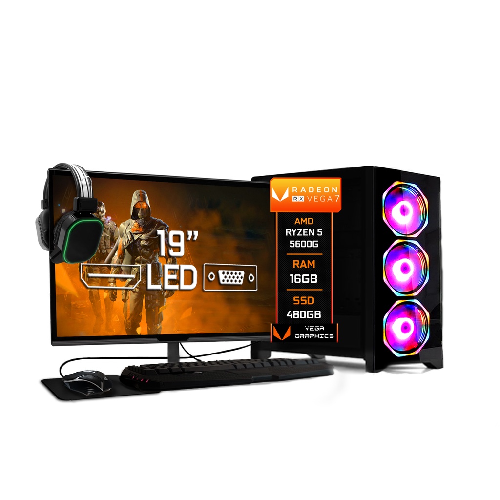 Pc Gamer Completo Fácil, Amd Ryzen 5 5600g 3.9ghz, Radeon Vega 7, 8GB,DDR4, SSD 480GB,Fonte 500w - Monitor 19" Kit Gamer.