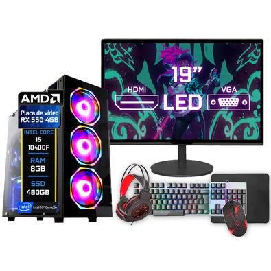 PC Gamer Fácil Completo, Intel Core I5-10400F, 8GB DDR4, AMD RX 550 4GB, SSD 480GB, Windows 10 Trial + Monitor 19 LED HD + Kit Gamer