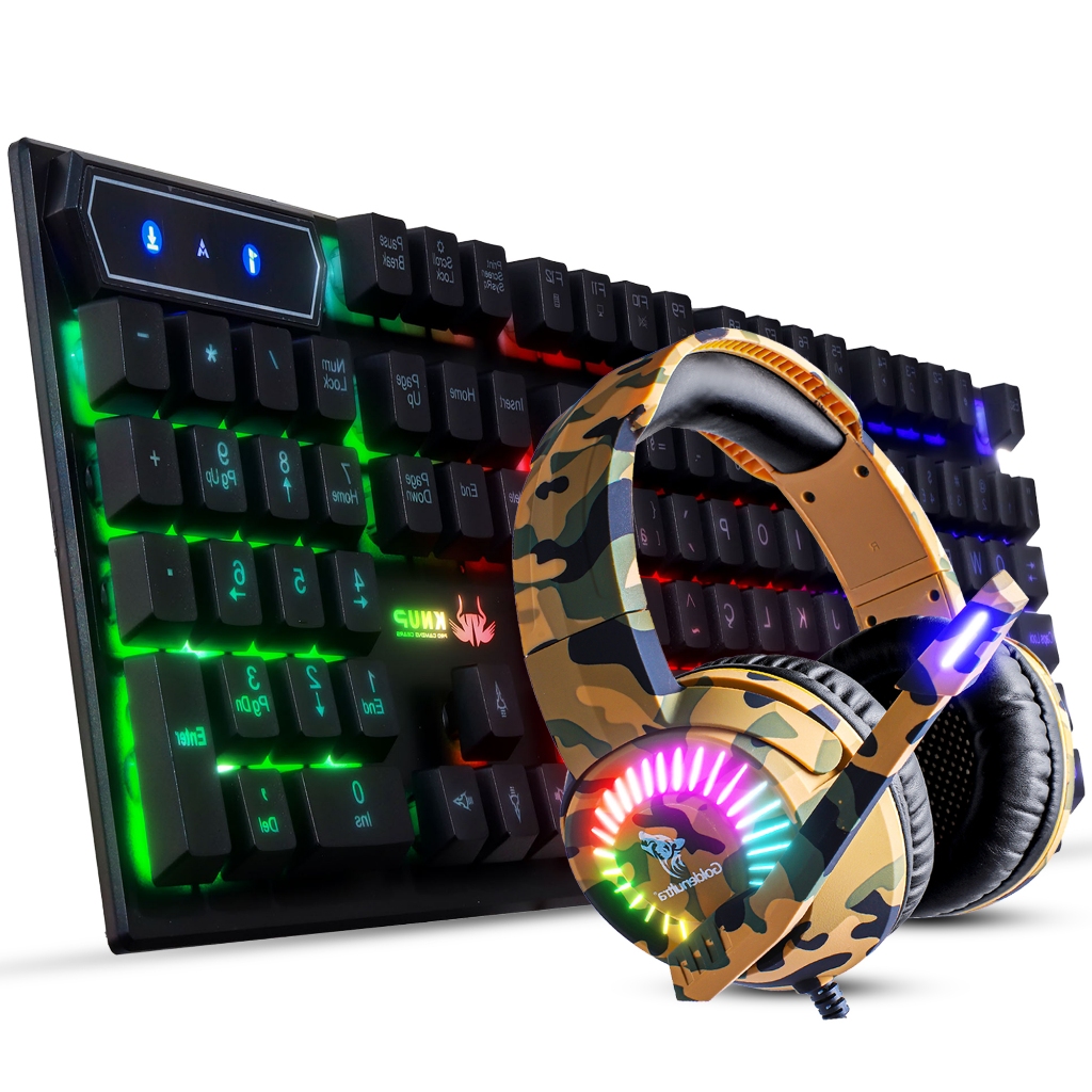 Kit Teclado Gamer Led Rgb Semi Mecânico Anti-Ghost Com Fio USB + Fone Gamer Camuflado USB Aux P2