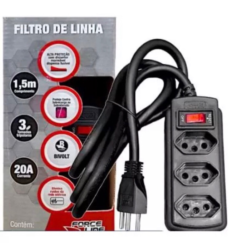 Filtro de linha, 3 tomadas, 1,5m, 20A, Bivolt, Preto, Force-line - BT 1 UN