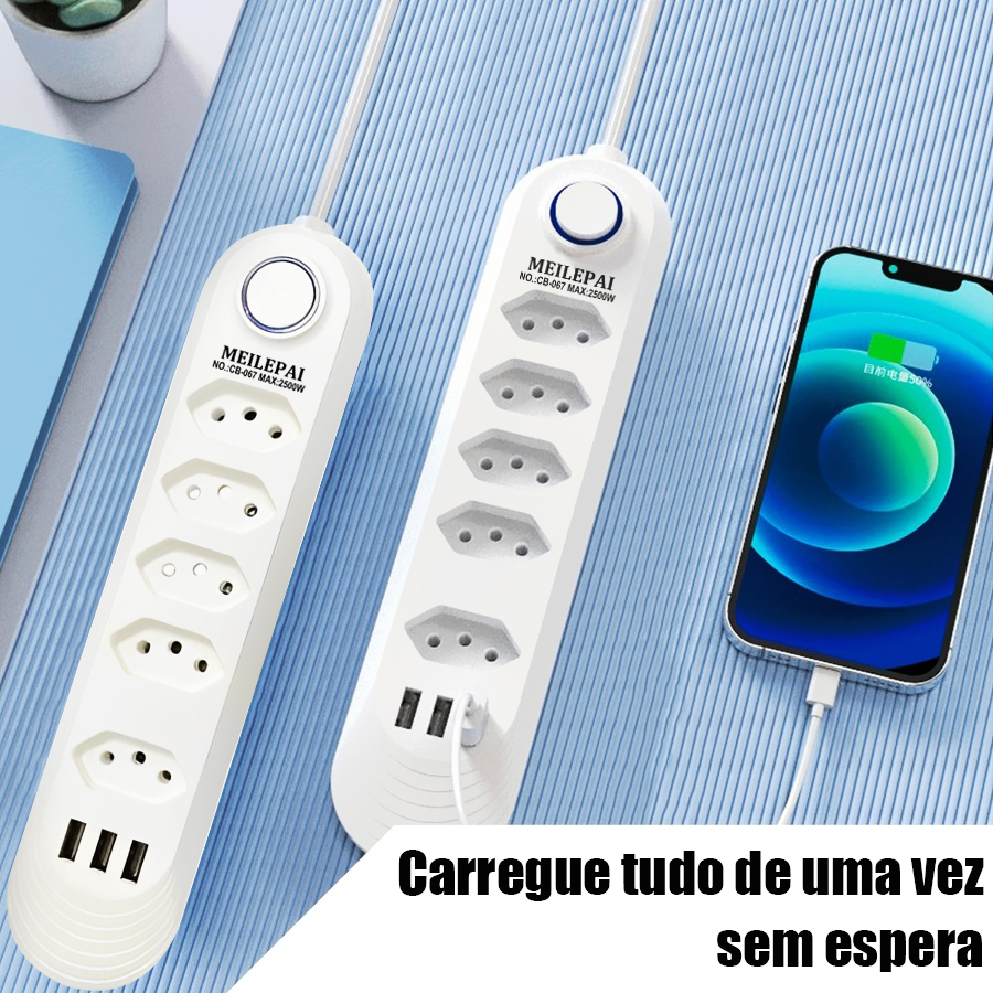 Filtro De Linha Extensão Eletrica Regua Com 5 Tomadas + 3 Entradas USB 10A/2500W