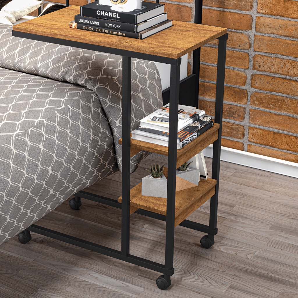 Mesa Auxiliar para Sofá Cama com Rodízios e Prateleiras Fit Canela Rústico com Preto.