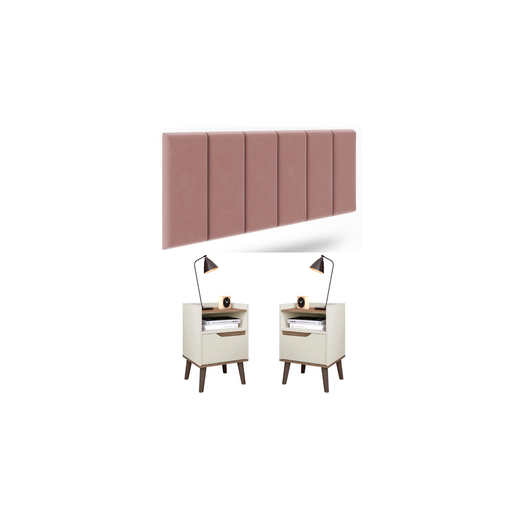 Conjunto Cabeceira Casal 1,40 Julia Bege com Kit 2 Mesas de Cabeceira rpm Off White/Canela - Lojas rpm